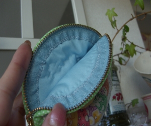 中は無地ブルー、パイピングはグリーンのピンドットです